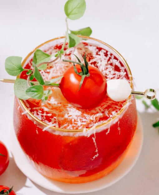 - Pizza Negroni: Basil & Oregano Infused Gin, Vermouth, Tomato Water. Garnished woth fresh shredded mozerella.